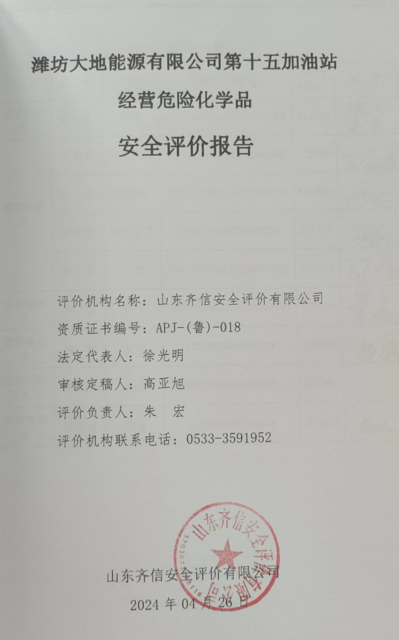 濰坊大地能源有限公司第十五加油站位于山東省濰坊市濰城區安順路50號,該站成立于2014年12月04日,取得濰坊市濰城區市場監督管理局頒發的營業執照。法定負責人為何姍娜,主要負責人何姍娜。該加油站主要從事汽油和柴油的經營,經營方式為零售。 該站于2020年01月21日換取了《成品油零售經營批準證書》(證書編號:魯油零售證書第3707161011號),有效期自2020年01月21日至2025年01月21日。該站持有的《危險化學品經營許可證》(證書編號:魯濰危化經[2022]002022號),有效期自2022年08月20日至2025年08月19日。該加油站在營業期間未發生安全事故。 該加油站現有埋地油罐4個,儲罐均為埋地雙層SF臥式儲罐,單罐容積均為30m3,汽油罐3個,柴油罐1個,柴油折半計入,該加油站油罐總容積為105m3,根據《汽車加油加氣加氫站技術標準》(GB50156-2021)第3.0.9條之規定,為二級加油站。 根據《中華人民共和國安全生產法》(中華人民共和國主席令〔2002〕第70號,經主席令〔2009〕第18號修訂,經主席令〔2014〕第13號修訂,經主席令〔2021〕第88號修訂)、《危險化學品安全管理條例》(中華人民共和國國務院令〔2002〕第344號,經國務院令〔2011〕第591號修訂,經國務院令〔2013〕第645號修訂)、《危險化學品建設項目安全監督管理辦法》(國家安全生產監督管理總局令[2012]第45號,[2015]年第79號修改)、《關于開展化工裝置設計安全診斷工作的意見》(魯安監發[2011]118號)、《關于加快推進化工裝置設計安全診斷工作的通知》(魯安監發[2012]146號)、《山東省安全生產條例》(山東省人民代表大會常務委員會公告〔2017〕第168號,〔2021〕第185號修訂)等的要求,全省所有未經正規設計(沒有設計或者設計內容不全;設計單位不具備相應資質;雖有設計但企業擅自改造后與原設計有較大出入,相關工藝安全要求發生重大變化;僅有安全設施設計專篇、沒有項目的施工圖設計)的化工生產裝置和儲存設施,必須由具備相應資質的設計單位進行設計安全診斷,查找存在的安全隱患,出具安全診斷報告書;進行經營危險化學品安全現狀評價。本加油站已經山東鴻運工程設計有限公司出具設計安全診斷報告;我公司受委托進行安全現狀評價。 接受委托后,我公司立即成立評價組,在進行資料與標準收集、現場調研、項目資料分析、危險與有害因素分析的基礎上,依據《山東省加油站安全評價導則》(魯安監發[2006]114號),在經營單位的通力合作下,對加油站進行了評價并編寫完成了《濰坊大地能源有限公司第十五加油站經營危險化學品安全評價報告》。 |